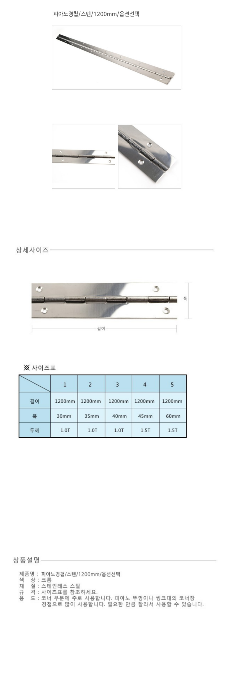 피아노경첩/스텐/1200mm/옵션선택