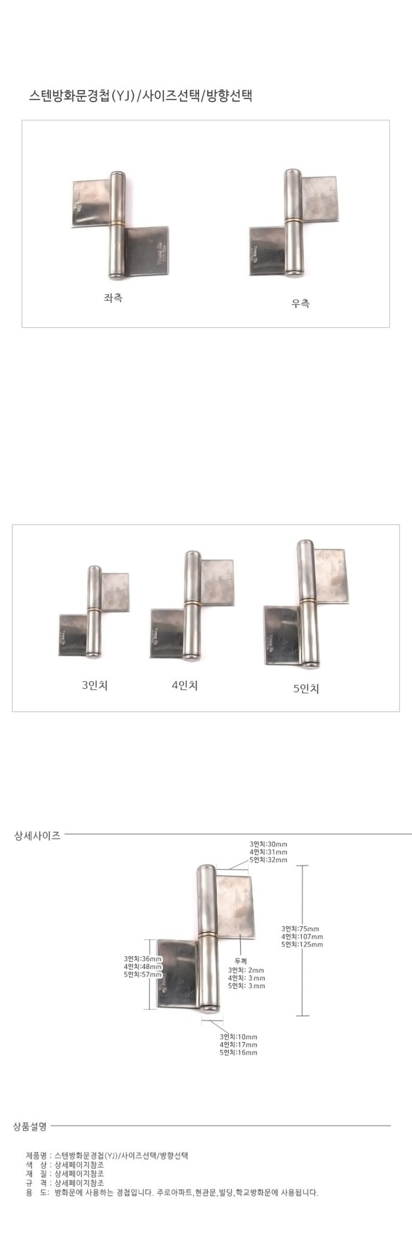스텐 방화문경첩(YJ)/사이즈선택/방향선택
